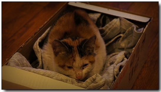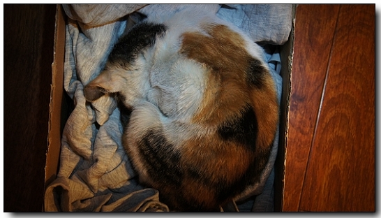 家弟找了个纸盒,里面垫上棉质旧内衣,让花喵呼呼。