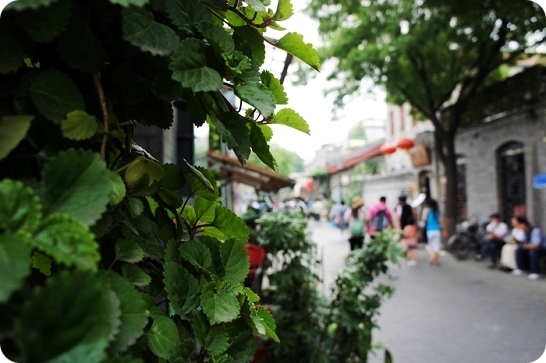 透过绿色植物看南锣鼓巷。