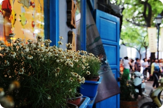 这张的焦点在雏菊,背景蓝色的门反倒很出彩。很是喜欢。